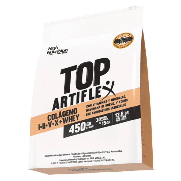 TOP Artiflex es una solución integral para el cuidado de tus articulaciones, músculos y mente. Diseñado para quienes exigen más de su cuerpo —ya sea por actividad física, desgaste articular o envejecimiento— combina colágeno hidrolizado tipo I, II, V y X con proteína Whey, aminoácidos esenciales, vitaminas y minerales para una recuperación y rendimiento óptimos.